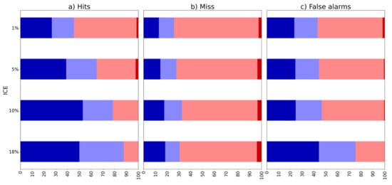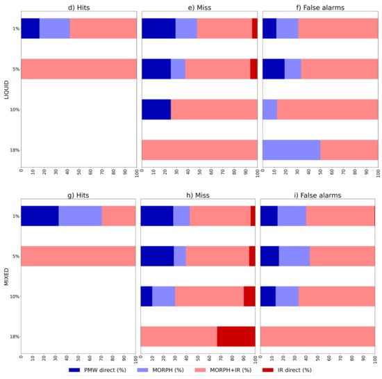 Figure 9 shows the distributions of the percentages of each IMERG source causing hits, false alarms, and misses compared to RG. This analysis was also performed considering various precipitation intensity thresholds according to all case study data and divided according to the phase of the precipitating cloud.