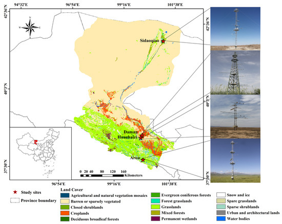 The Heihe River Basin is the second-largest inland basin in the region of Northwest China (97.12°E–102.08°E, 37.73°N–42.74°N), with hot summers and cold winters. As is characteristic of arid and semi-arid environments, the region has little and irregularly distributed precipitation, primarily in the summer. Due to human interference and the local drought-prone climate, the ecological balance is delicate. The vast regional coverage, differing climate, and terraced terrain, extending from the upstream to the downstream, combine to create the rich and varied natural landscape of the Heihe River Basin. The upstream is dominated by alpine meadows, the midstream is primarily made up of artificial oases and irrigated areas, and the downstream is mostly covered by the Gobi Desert, except for a small stretch of riparian forests along the Heihe River. The Heihe River Basin is heavily dependent on water resources because of predominantly irrigated agriculture, and as cities and industries expand, so does the demand for water resources. The development of the Heihe River is time-honored, and human activities have significantly affected its ecological environment. The abovementioned characteristics make the Heihe River Basin an ideal region for conducting integrated watershed studies. The land cover and the locations of the flux towers selected for the evaluation are shown in Figure 1.