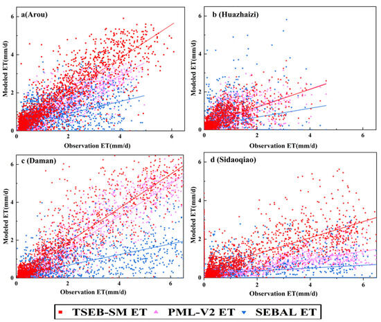 Scatterplot of TSEB-SM ET, PML-V2 ET, and SEBAL ET compared with ground observations.