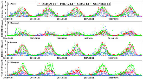 Temporal variations in the TSEB-SM ET, PML-V2 ET, and SEBAL ET (mm/d) against the observations for Arou (a), Huazhaizi (b), Daman (c), and Sidaoqiao (d).