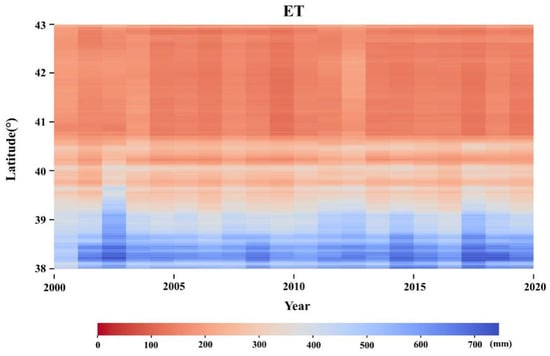 Significant spatial discrepancies are highlighted in Figure 4, which depicts the regional characteristics in yearly cumulative ET in the Heihe River Basin from 2000 to 2020. There were significant variations in ET between the midstream irrigation area and the downstream Gobi Desert (up to 600 mm/year), with the annual total ET in the study region ranging from 100 to 750 mm/year. The midstream irrigated oasis zone showed the highest yearly cumulative ET, while the downstream Gobi Desert region showed the least ET. There are a great deal of summer precipitation, significant fluctuations in temperature, and rapid evaporation in the upstream watershed of the Qilian Mountains region. The midstream Hexi Corridor region experiences a drier climate than the upstream regions. Despite being in a dry and semi-arid area with little precipitation, the midstream artificial oasis region (around 40°N) has the strongest ET. The reason for this is that there are many irrigated agricultural regions that are supplied with water from reservoirs in the Qilian Mountains, and these dry climatic circumstances lead to an intense need for atmospheric evaporation. All of the downstream areas are covered by the Gobi Desert except for a small amount of oasis existing along the Heihe River, and the downstream area has low precipitation and strong evaporation, so ET is mainly provided by soil evaporation, but the ET here is the lowest in the study area. The interannual fluctuations in ET in the Heihe River Basin from 2000 to 2020 were not very significant, with little year-to-year variation. In addition to the relatively stable climate and precipitation in the study area, it is also inseparable from the active water management initiatives undertaken by the local government. In May 2000, in response to ecological problems such as the drying up of rivers and lakes, death of forests, and rampant sandstorms in the Heihe River Basin, the government departments concerned carried out water dispatching work for the main stream of the Heihe River to reasonably manage water usage along the Heihe River Basin, thus reducing the occurrence of cutoffs. In September 2001, a severe drought was experienced in the midstream region, but the impact of this drought on the midstream region was reduced by a reasonable allocation of water.