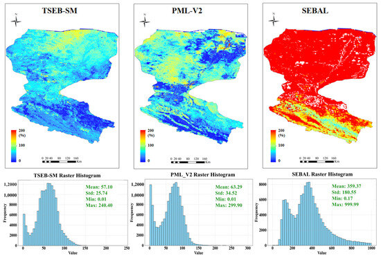Figure 5 illustrates the pixel-by-pixel relative uncertainty and statistical histograms of the TSEB-SM, PML-V2, and SEBAL ET products in the Heihe River Basin. Overall, the TSEB-SM and PML-V2 products have substantially smaller relative uncertainty than SEBAL ET. From the statistical histograms, it appears that most of the relative uncertainty values for TSEB-SM ET are distributed between 50 and 70%, those for PML-V2 ET are mainly in the range of 70–90%, and those for SEBAL ET are in the range of 60–70% in the upstream portion of the region, with most of the rest exceeding 200%. The high relative uncertainty values of TSEB-SM ET are mostly distributed in the downstream arid Gobi area and a few grassland areas in the upstream and midstream. Most of the high relative uncertainty values of PML-V2 ET are distributed in the downstream Gobi Desert region, with some being distributed in the midstream irrigation regions and upstream alpine meadow region. The high relative uncertainty values for SEBAL ET are also predominantly distributed in the downstream and midstream regions. This is similar to the results of the previous (Section 4.1) comparison with the ground station observations, where all three products were underestimated in the downstream, resulting in high relative uncertainties. It is worth noting that TSEB-SM ET has lower relative uncertainty in the midstream irrigation region compared to the upstream alpine meadow region. This is primarily due to the input of soil moisture into the TSEB-SM model, which monitors the large amount of water depletion in the yield of the early crop-growing season and, thus, simulates surface evapotranspiration with greater accuracy. Also, the relative uncertainties of all three products are lower in the upstream of the Heihe River Basin, which is mainly due to the fact that the upstream is primarily alpine meadows with abundant rainfall, and for both TSEB-SM ET and PML-V2 ET based on the energy balance and PML-V2 ET based on the P-M equations of the physical model, a better simulation of surface evapotranspiration can be carried out. Generally, TSEB-SM ET outperformed PML-V2 ET and SEBAL ET in arid and semi-arid regions at the watershed scale.