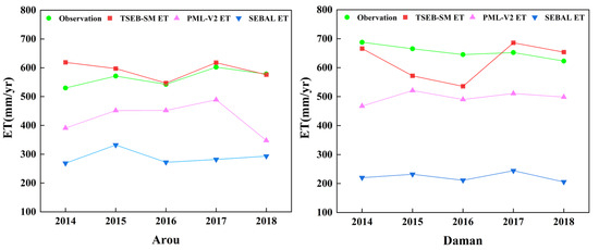 The annual ET of three products and observations from 2014 to 2018 at the Arou and Daman sites.