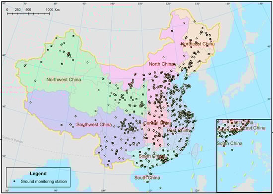The hourly average PM2.5 concentration data of the 2014 monitoring stations (Figure 1) in China from January 2014 to December 2021 were downloaded from the official website of the China Environmental Monitoring Center (CNEMC, https://air.cnemc.cn:18007/, accessed on 22 March 2022). Then, the annual average PM2.5 concentration data from 2014 to 2021 of all ground monitoring stations with geographical location information were obtained. The spatial distribution of monitoring stations generally presented heterogeneity with a larger number of stations in the east of China (Figure 1).