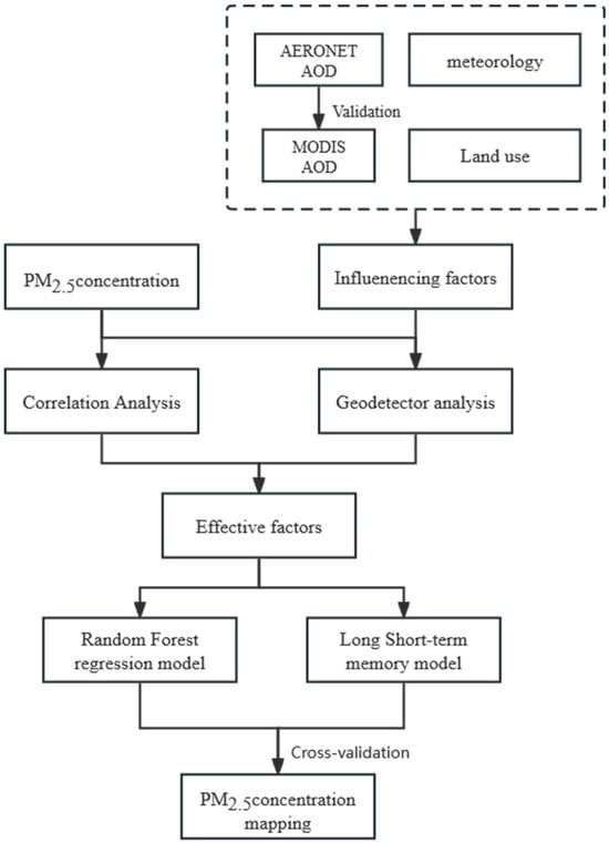 Aerosol optical depth (AOD), an indicator of atmospheric turbidity, refers to the integral of the extinction coefficient of a medium in the vertical direction [8]. Many studies have demonstrated a strong correlation between AOD and near-surface PM2.5 concentrations [9,10,11]. Satellite-based PM2.5 estimation generally involves two steps. First, the retrieval of satellite observation data is used to obtain AOD distribution products, then the estimation model of PM2.5 concentration is established based on AOD data and other auxiliary data.