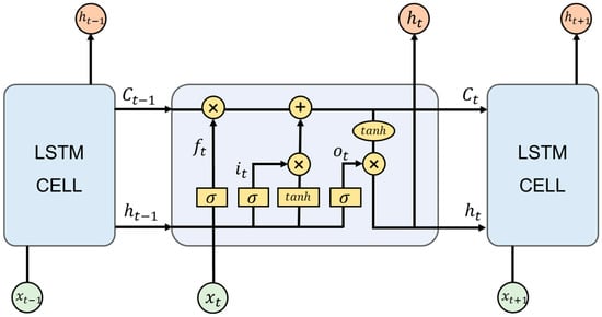 The LSTM model is an improved approach to recurrent neural networks (RNNs) [77]. An RNN adds the relationship between before and after time series based on a fully connected neural network, which can solve the problems related to time series, but the explosion and disappearance of the gradient may occur at distant nodes [78]. LSTM is designed to solve this problem. The LSTM consists of memory cells and a gate mechanism. Each memory cell contains a cell state and three gates: the forget gate, input gate, and output gate (Figure 3). The three gates have sigmoid activation function control which changes in their cell state.