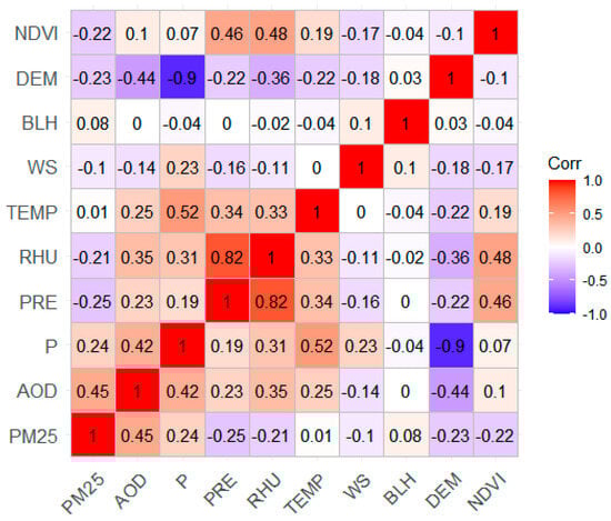 Pearson’s correlation coefficient analysis was used to assess the correlation between each dependent variable and PM2.5 concentration. The results of the Pearson’s correlation coefficient showed that the relationship between independent variables and PM2.5 concentration was moderately positive and weakly negative (Figure 6), especially for the AOD (r = 0.45, p < 0.01) and PRE (r = −0.25, p < 0.01). In addition, considering the issue of covariance among the independent variables, we used the VIF to make judgments. Table 3 shows a strong covariance between P and DEM (P ~ 16.91, DEM ~ 13.43). Differences in atmospheric pressure in years would be more sensitive than in the DEM data, so the variable P was chosen and the variable DEM was excluded.