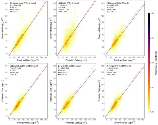 The density scatterplots of model validation results. (a) Sample-based CV for the RF model, (b) Spatial CV for the RF model, (c) Temporal CV for the RF model, (d) Sample-based CV for the LSTM model, (e) Spatial CV for the LSTM model, and (f) Temporal CV for the LSTM model. The colors of points represent the percentages of the total number of points in the value range. The solid red line denotes the line of best fit using linear regression and the gray dashed line represents the 1:1 line. The units of the RMSE and MAE are μg m−3.