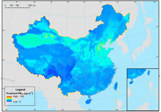 According to the model validation results, we chose the RF model to estimate the annual average PM2.5 concentration at a 10 km spatial resolution in 2021 (Figure 8).