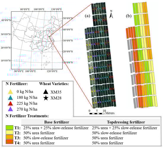 Diagram of the winter wheat experimental site. (a) RGB image marked with multiple nitrogen fertilizer levels application, and (b) experimental design with multiple fertilizer treatments.