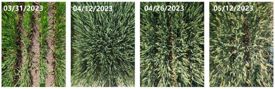 Growth-related bio-parameters, including the LAI, LCC, and CCC, were collected during the growing season (Table 1). Examples of ground photos reflecting crop growth status are shown in Figure 2, the photos were taken at a height of approximately one meter above the wheat canopy. The LAI and LCC measurements were conducted within a 1 m2 area in each field plot. Each ground sample area’s center position was recorded using a standard portable navigational equipment combining the Network Real-Time Kinematic technology (Network RTK). The LAI value was obtained using an LAI-2200C plant canopy analyzer (Plant Canopy Analyzer, LI-COR, Lincoln, NE, USA). For each sampling area, one sky value and five target values recorded by LAI-2200C were utilized in the LAI calculation of crop canopy. The sky value served as the calibration reference, while the average of the five target values was taken as the ground truth LAI for the corresponding site. Measurements were executed between 16:00 and 18:00 local time, specifically avoiding direct sunlight whenever possible.