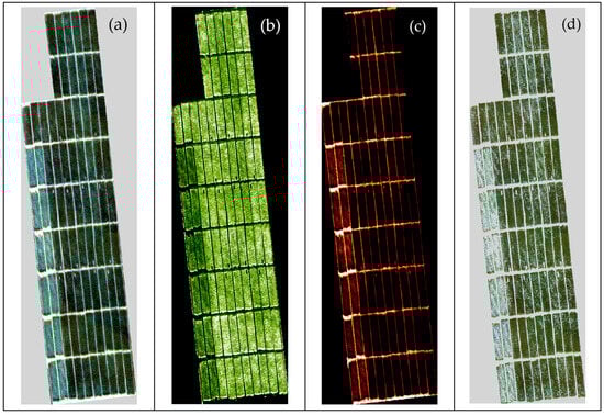 The results of wheat extraction based on the sequential maximum angle convex cone (SMACC) method. (a) RGB Image, (b) wheat abundance, (c) soil abundance, (d) wheat image after removing soil background.
