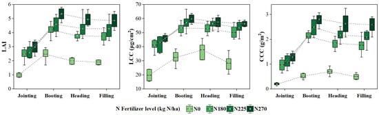 Figure 4 shows the LAI, LCC, and CCC values of winter wheat at four growth stages under different nitrogen fertilizer levels. The results showed that LAI values presented a consistent changing trend under different N fertilizer levels, and reached their maximum at the booting stages. Similar to the changing trend of LAI, LCC, and CCC values of winter wheat under N180, N225, and N270 treatments reached their maximum at the booting stage, and started to decrease afterward. The results indicated that the bio-parameter values of wheat are at their peak during the booting stage, and then begin to decrease. This is because nutrients and water are primarily utilized for the growth of roots, stems, and leaves of winter wheat before the jointing state, and then they are allocated to the growth of wheat spikes. Besides, as the leaves in the lower layer within the canopy senesce, this leads to changes in bio-parameters traits of the canopy. Note that the LCC and CCC values of winter wheat under N0 treatment reached their maximum at the heading stage. This relative delay phenomenon may be caused by the slow growth of wheat leaves due to nitrogen deficiency. The standard deviations of LCC at high N levels were lower than those at low N levels, indicating that the crop canopies with sufficient N fertilizer were more homogeneous, while the standard deviation results of LCC were the opposite for LAI and CCC. Overall, the values of three bio-parameters were roughly correlated with N fertilizer and presented a similar changing trend across the four growth stages.