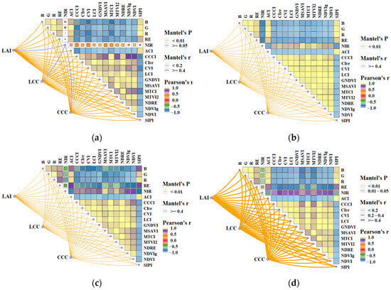 The results of correlation analysis between three bio-parameters and spectral variables at four stages of winter wheat. (a) Late jointing, (b) booting, (c) heading, and (d) early filling stage.