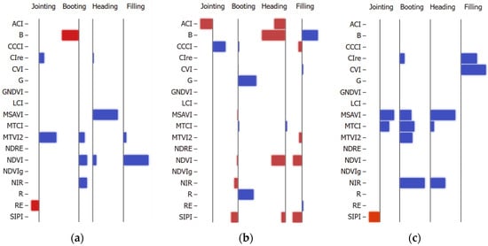 Figure 6 shows the selected feature variables by the LASSO model for each bio-parameter and growth stage. The optimal combination of variables can be selected by the LASSO internal selector to simplify the model. LASSO reduces the coefficients of unimportant features to zero, and the size of the coefficient reflects the impact of the feature on the target variable. A coefficient with a larger absolute value indicates that the feature has a significant impact on the target variable, while a coefficient with a smaller or zero value indicates that the feature has a smaller or non-existent impact on the dependent variable [29,52]. The results showed that the selected feature variables at each growth stage were quite different; thus, this also demonstrated that it was not appropriate to choose a unified variable for further research. It was noted that MTVI2 and NDVI were the top selected feature variables for LAI across all growth stages, CCCI, NDVI, and SIPI were the preferred feature variables for LCC across all growth stages, while MSAVI, and MTCI were the favored feature variables for CCC across all growth stages.