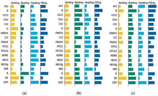 The feature importance ranking from RF of winter wheat at four growth stages. (a) LAI, (b) LCC, and (c) CCC.