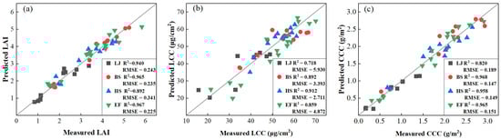 The validation results of the SFS-SVR model in evaluating the LAI (a), LCC (b) and CCC (c) status of winter wheat at four growth stages. (LJ: late jointing, BS: booting, HS: heading, EF: early filling stage).