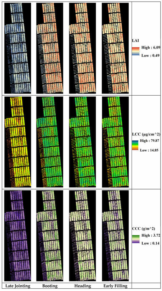 Winter wheat is a crucial grain crop that plays a pivotal role in global food security and agricultural sustainability. In recent years, the significance of winter wheat research has been underscored by the growing challenges posed by climate change, population growth, and the need for sustainable agricultural practices [1,2]. Crop biophysical and biochemical parameters provide important information about various aspects of crop conditions that have direct implications for productivity. Leaf area index (LAI) is a key biophysical parameter for quantifying crop canopy structure and function. Previous studies have highlighted the significance of LAI data in enhancing estimates of crop yield and land–atmosphere carbon dioxide exchanges by updating state variables in process-based agroecosystem models [3,4,5]. Canopy chlorophyll content (CCC) is defined as the total chlorophyll content per unit ground area in a contiguous group of plants, serving as a valuable metric for estimating canopy nitrogen content, vegetation physiological status and gross primary production [6,7]. Different from other crop physiological and biochemical traits, leaf chlorophyll content (LCC) directly reflects the nutrition status of individual crop plants. LAI, LCC, and CCC serve as crucial phenotypic traits in corps, offering effective insights into crop growth, plant health and yield prediction [8,9]. Timely monitoring and accurate estimation of the bio-parameters are necessary for grasping wheat growth dynamics and offer guidance for field management.