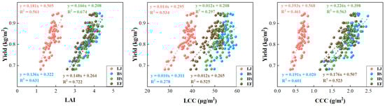 The study also demonstrated the importance of bio-parameters in evaluating comprehensive yield traits of winter wheat, which is consistent with previous research results [59,61]. Further correlation analysis between wheat yield and LAI, LCC, and CCC confirmed that the bio-parameters are important indicators for yield estimation, but their relationship varied depending on the growth stage (Figure 10). In addition, the correlation between yield and LCC was low (R2 = 0.534 at LJ), indicating that it is difficult to accurately evaluate wheat yield using LCC alone. As a product of the combination of LAI and LCC, the correlation between CCC and yield had improved (R2 = 0.601 at BS), but did not exceed the correlation between LAI and yield (R2 = 0.722 at EF). The high correlation between yield and LAI indicated that LAI can better characterize the winter wheat growth status, while achieving better yield evaluation. Therefore, further research should use LAI as an important factor for assimilating the wheat yield prediction model.