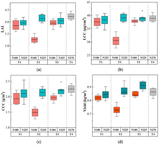 The variation in winter wheat LAI (a), LCC (b), CCC (c) and yield (d) under different N treatments. N represents the nitrogen fertilizer level (180, 225, 270 kg N/ha). Treatment T1 received fertilizer split a half mixing of urea and slow-release fertilizers in a proportion of 1:1 at sowing and a half mixing of urea and slow-release fertilizers in a proportion of 1:1 at the jointing state; T2 received fertilizer split a half urea fertilizer at sowing and a half slow-release fertilizer at the jointing state; T3 received fertilizer split a half slow-release fertilizer at sowing, and a half urea fertilizer at the jointing state; T4 received fertilizer split a half urea fertilizer at sowing and a half slow-release fertilizer at the jointing state.