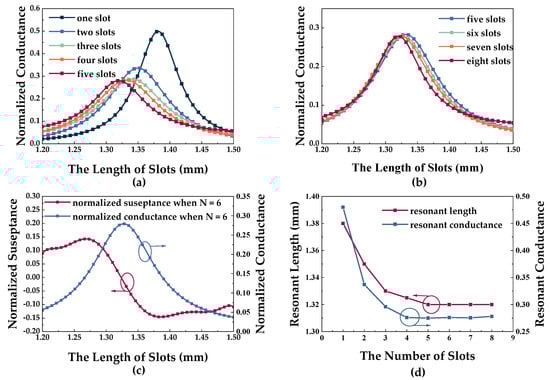 Using Equation (11), function curves of the normalized conductance and the normalized susceptance vary, with l being obtained while keeping x unchanged. For example, Figure 2 shows the measured data in different N when . Figure 2a,b show the function curves of vary with l when N varies from 1 to 5 and from 5 to 8, respectively. The resonant length makes reach its extreme points, and the resonant conductance of the slot can also be obtained. When the slot is in the resonant state, the susceptance is 0, and the radiation efficiency is the highest, as shown in Figure 2c. Figure 2d shows the curves of and as N changes. and keep decreasing with the increase in N, but when , the changes in and trend to stable. Furthermore, the results show that the impact of the slot coupling on the equivalent conductance increases with increasing N, while the resonant conductance and length decrease. When the number of slots reaches more than five, the coupling effect becomes negligible, indicating that the number of slots N, used in the analytical model, is at least five.