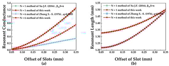 By repeating the above process many times, the resonant conductance and resonant length under a different offset x can be obtained. Meanwhile, the fitting functions and can be constructed. The function describes the relationship between and x, and describes the relationship between and x. Figure 3a,b show the data curves of and calculated by different methods, respectively, which can be used in the low sidelobe SIW antenna design. The red curves are calculated by Equation (11) when and , respectively. The light green curves are calculated by the equation in [26] when N = 1 and . The red and light green curves show a high degree of agreement, which demonstrates the correctness of the method proposed in this work. In addition, the method in [26] is affected by the phase term associated with phase propagation constant and S, while the method proposed in this work is not affected by the phase term as shown in Equation (11). This is because the phase term is canceled out during the derivation due to the cascading nature of the T-matrix. The light blue curves are calculated by the method in [29] when N = 6 and q = 0.9905. In this method, q is a constant associated with the loss factor and length S. This method can calculate the conductance under the impact of the slot coupling but cannot obtain susceptance data. In contrast to the method in [29], the method proposed in this work not only can measure the conductance under the impact of the slot coupling but can also calculate the susceptance data. Moreover, this method is not affected by the constant q.