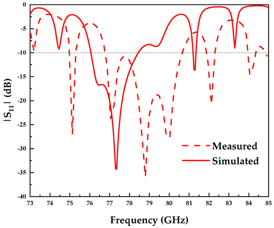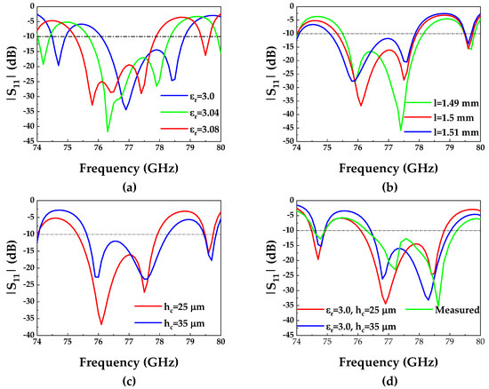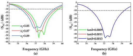 - The variation in the permittivity results in a shift in the operating frequency. The dielectric substrate employed in this work is Rogers RO3003, which exhibits a permittivity of 3.0 at 10 GHz. Drawing on engineering experience, the permittivity of this material fluctuates within a range of 3.0 to 3.12 at 77 GHz. In simulations, the permittivity is set as 3.07 in this work. Figure 17a illustrates the impact of permittivity variation on . The simulation results indicate a decrease in operating frequency as the permittivity increases. Therefore, the actual measured permittivity values should be less than the simulated permittivity values, which leads to a shift in measured operating frequency.