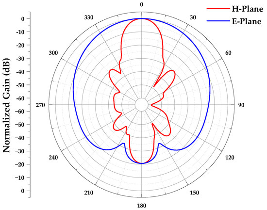In the E-plane, there are quite a few differences between the simulated and measured normalized radiating patterns at a large angle, and the primary reason is attributed to the electromagnetic wave obstruction by the absorbing materials. As shown in Figure 22, the antenna pedestal and the antenna were surrounded by numerous absorbing materials. These materials were used to prevent reflections from the metal of the antenna pedestal from affecting the measurement results. Therefore, when the antenna and pedestal rotated to a large degree, the absorbing materials absorbed and blocked a portion of the electromagnetic wave, leading to a reduction in the power of the electromagnetic wave received by the antenna. This phenomenon explains why the measured gain began to decrease when the rotation angle exceeded 60 degrees, particularly in the E-plane. Moreover, when the rotation angle surpassed 120 degrees, the electromagnetic waves were almost entirely occluded by the absorbing materials.