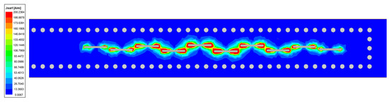 To calculate the equivalent admittance affected by the slot coupling in the linear array, an SIW analytical model with slots is considered. For example, Figure 1a shows the model with 6 slots. In this model, the spacing between slots is half of a waveguide wavelength . To maintain the phase consistency, slots are arranged alternately on either side of the center line with the slot offset x from the center line. The dielectric substrate material used is Rogers RO3003, which has a permittivity of 3 and a loss tangent of 0.0013 at 10 GHz. This material is sourced from Rogers Corporation in Rogers, Connecticut, USA. Depending on the engineering experience, the permittivity of Rogers RO3003 may vary slightly at 77 GHz. Therefore, the permittivity of the dielectric substrate used in simulation is adjusted to 3.07. At the operating frequency of 77 GHz, the parameters of the SIW are set as , , , and to satisfy the conditions of the single model transmission and lockage characteristics. The initial value of slots’ parameters are set as , , .