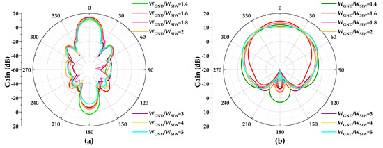 The simulation results are shown in Figure 7 and Figure 8. Figure 7 shows for the low sidelobe antenna. The proposed design achieves excellent impedance matching at 77 GHz, exhibiting a frequency impedance bandwidth of 4.8%. Figure 7a indicates that changes in the permittivity affect the operating frequency of the antenna. Furthermore, Figure 7b shows that the tuning performance is not influenced by variations in the dielectric loss tangent. Figure 8 illustrates the normalized radiation patterns in both the H-plane and E-plane at 77 GHz. Based on the simulation results, the antenna achieves a gain of 13.2 dBi. The beamwidth is measured at 64° in the E-plane and 17° in the H-plane. Additionally, the antenna exhibits an SLL of −29 dB in the H-plane. Both the beamwidth and SLL meet the specified requirements. Furthermore, Figure 9 presents the surface current distribution at 77 GHz highlighting noticeable amplitudes in slot regions. It is noteworthy that an alteration in the the ground plane width induces variations in the radiation patterns, as depicted in Figure 10 showcasing these variations through the width ratio. According to the simulation results, the alteration has a large impact on the gain, and there is a suitable ratio to maximize it. The H-plane pattern is found to be less affected by the ratio change, as depicted in Figure 10a. However, the E-plane pattern exhibits a significant sensitivity to the ratio change, as illustrated in Figure 10b. Particularly for extremely large ratios, there is a notable reduction in gain and substantial widening of the beamwidth in the E-plane. Moreover, the E-plane beam fluctuates in the direction of the primary radiation. The primary factor contributing to this phenomenon is the transverse motion of the surface current. As the width of the ground plane increases, the current path also increases and the superposition of current phases significantly influences the radiation intensity in the E-plane. Moreover, the variation in the S-parameter affected by the width variation is shown in Figure 11. The impedance matching remains excellent despite the variation width.