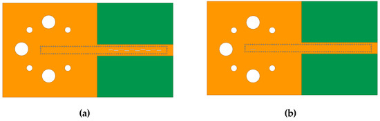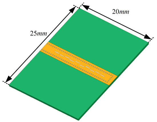 According to Figure 11, a suitable width ratio should be chosen to maximize the antenna gain. In addition, the width of the dielectric substrate is expanded to 25 mm to replicate the influence of the millimeter-wave radar printed circuit board (PCB) on the antenna, as shown in Figure 18. The antenna simulation model connected with transition is shown in Figure 19a,b. Figure 19a shows the top view of the antenna with radiating slots, and Figure 19b shows the bottom view of the antenna with a coupling slot as the transition from a standard RWG to SIW. Furthermore, to measure the actual performance of the antenna, a prototype is manufactured using the PCB process. Figure 20a,b show the top view and bottom view of the prototype, respectively.