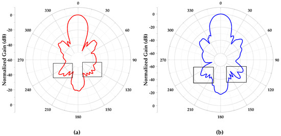 As depicted in Figure 24, there is a slight asymmetry in the H-plane radiation pattern, notably within the ranges of 210 to 240 degrees and 120 to 150 degrees. Within these intervals, a discernible difference in gain is evident. This phenomenon is predominantly influenced by the presence of the larger GND in the antenna model. To corroborate this observation, a simulation model without a large GND was executed. Figure 25 demonstrates the two simulation models, with and without the large GND. Figure 26a,b show the simulation results of antenna models with GND and without GND, respectively. Based on the comparative results (areas circled by squares), the asymmetry in the radiation pattern was mitigated upon the removal of the ground plane (GND).