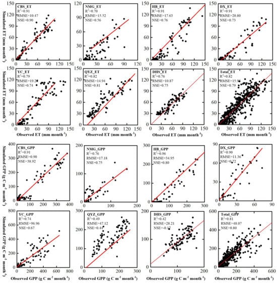 The gsx in the ET model and ε in the LUE model act as the most sensitive parameters for regional ET and GPP simulations [27,41]. We used the aforementioned flux sites and the coefficient of determination (R2), root mean square error (RMSE), and Nash–Sutcliffe efficiency (NSE) to optimize these two parameters and further improve the model performance. The final, optimized parameters are shown in Table 2.