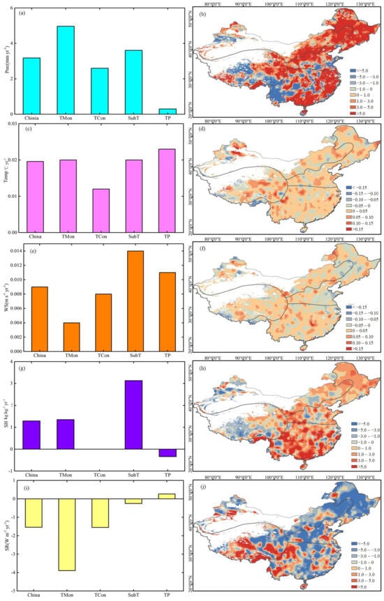 Trends of climate factors from 1999 to 2018 over Mainland China. Note: SH is expanded by 105 times. (a,c,e,g,i) includes the statistical trends in sub-regions from 1999 to 2018. (b,d,f,h,j) includes the spatial distributions of trends for five climatic factors over China from 1999 to 2018.