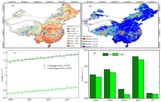 Trends of LAIH driven by anthropogenic activities and actual LAI from 1999 to 2018 over Mainland China. (a,b) are, respectively, the spatial trend and significance of LAIH over China from 1999 to 2018. (c) represents the slopes of LAIH and actual LAI over China from 1999 to 2018. (d) is the trends of LAIH and actual LAI over sub-regions in China from 1999 to 2018.