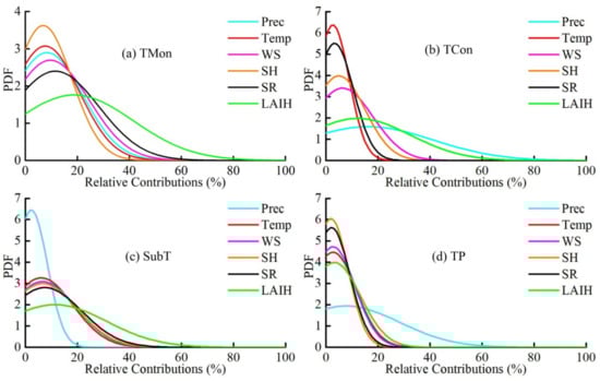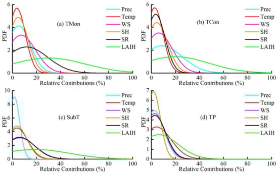 Figure 7 and Figure 8, respectively, show the probability density functions (PDFs) of the relative contributions of climatic factors and anthropogenic activities to the variations in ET and GPP in the four sub-regions of China. Table 3 lists the corresponding mean relative contribution values in the four sub-regions (%). These values are significantly different in the four sub-regions. The dominant driver of changes in ET is anthropogenic activities, with a mean relative contribution of 29.72% in TMon as a result of performing the large-scale Grain to Green Program. No mean contribution of climatic drivers is larger than 20%. Due to dry climate and vegetation restoration, both precipitation (mean relative contribution: 36.84%) and anthropogenic activities (mean relative contribution: 26.33%) are more important than other climate factors in controlling ET trends in TCon, while temperature plays the least important role, with a mean relative contribution of 5.64% due to cold weather in this sub-region. In SubT, precipitation has the lowest contribution of 5.73% due to the generally moist climate of the study area. The relative importance of other factors for ET trends in this sub-region is ranked as follows: LAIH with 28.50% > SR with 18.37% > SH with 16.43% > WS with 15.79% > Temp with 15.15%. In TP, the most important driver of ET trends is precipitation (mean relative contribution: 38.59%), followed by vegetation restoration (mean relative contribution: 15.78%) and temperature (mean relative contribution: 13.46%). The contribution of SH ranks lowest at 9.29%.