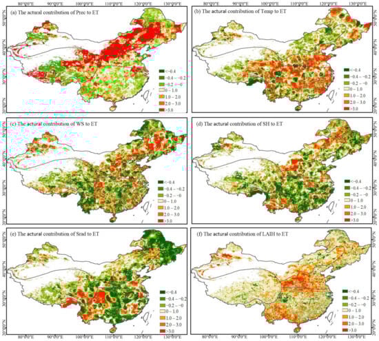 Although Figure 7 and Figure 8 show the relative contributions of influencing factors, they do not indicate positive or negative effects. The actual contributions calculated by Equation (27) can fill this gap. Figure 9 shows the significant spatial heterogeneity in the actual contributions of influencing factors. Precipitation has a very positive effect on ET trends in the east of TP and most of TCon, with values larger than 0.6 mm yr−1. Precipitation makes a negative contribution in the middle of TP and has a slightly negative influence on most of the SubT sub-regions. As shown in Table 4, precipitation has a mean positive value of 0.93 mm yr−1 for TCon and 0.02 mm yr−1 for TP due the offset of negative effects in the middle of TP, which indicates the higher sensitivity of ET to rainfall in TCon. The lowest-ranking negative contribution in the west of TCon and south of TMon can be attributed to the large fraction of irrigation croplands. The actual positive contribution of temperature (>0.6 mm yr−1) mainly exists in the east of China and east of TP, while the west of China and most of TCon show negative effects on ET trends. In addition to TCon, the wind speed makes negative contributions in TMon, SubT, and TP, with values of −0.06 mm yr−1, −0.14 mm yr−1, and −0.14 mm yr−1, respectively. Although SH shows a significantly positive contribution to ET in the north of TMon and southeast of SubT, TMon (−0.04 mm yr−1), TP (−0.12 mm yr−1), and SubT (−0.39 mm yr−1) show negative contributions based on the mean actual contributions (Table 4).