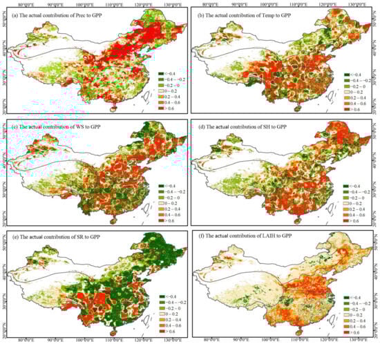 Figure 10 shows that the spatial distributions of the actual contributions of the influencing factors to GPP are similar to those of ET. Table 4 shows that the actual contribution ranks to GPP are different for temperature in comparison with ET. The rankings of the positive contributions of temperature to GPP are SubT (0.48 g C m−2 yr−1) > TMon (0.47 g C m−2 yr−1) > TP (0.46 g C m−2 yr−1) > TCon (0.04 g C m−2 yr−1); the rankings for ET are TMon (0.33 mm yr−1) > SubT (0.29 mm yr−1) > TP (0.18 mm yr−1) > TCon (0.00 mm yr−1). Although WS has the same rankings regarding the contributions to GPP and ET, the negative contributions over TMon, SubT, and TP are converted into positive effects. For SR and SH, there are conflicts among the ranks and types of contribution to ET and GPP. Across China, GPP is principally limited by anthropogenic activities.