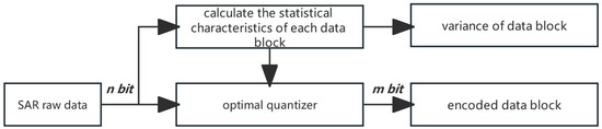 The block-adaptive quantization [27] algorithm is the most widespread and mainstream method in space-borne SAR data compression, having the advantages of a simple principle, convenient hardware implementation, great compression performance, and fast computation speed. Meanwhile, the drawbacks are obvious: one is the quantization limitation of the integer number of bits, and the other is the limitation of the compression performance caused by the homogeneous quantization. The BAQ algorithm uses an adaptive quantizer, according to the estimated standard deviation of each small block of input data, to control the optimal quantizer and to achieve the effective compression of the input data, as shown in Figure 1. The raw data received by the radar are sampled by an -bit high-precision ADC to obtain digital signals, and the block-adaptive quantizer encodes and processes the signals of bits per sample into the signals of bits per sample, thus realizing the compression of the raw data. The data compressed by the SAR system after BAQ are packaged and then downlinked to the ground or stored on the satellite. In the earth station, the data decoding operation can be carried out to recover the radar data according to each corresponding block of data. Generally, the size of the block is or (samples of azimuth range). The coding principle of BAQ is shown in Figure 1.