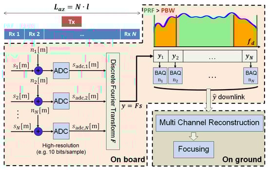 Schematic diagram of the MCBAQ process used in the literature [31]. MCBAQ compresses the echo data of -channel SAR: at each moment , the th channel receives the signal quantized by the high-precision ADC, and then MCBAQ decomposes the multichannel data of length by the DFT method; finally, the transformed coefficients are assigned appropriate bits to obtain the optimized compression performance.
