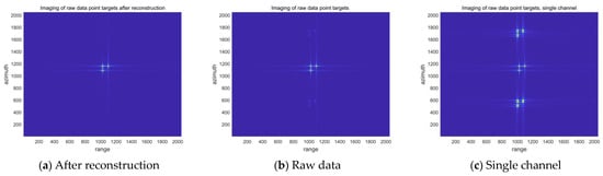 The process and results of the Krieger filter reconstruction are tested with point target simulation, and the image results are shown schematically in Figure 5. Comparing the multichannel imaging results after reconstruction, the multichannel nonuniform sampling information without reconstruction processing is manifested in the image as the appearance of false targets, and the single-channel imaging results are manifested as Doppler spectral aliasing. The parameters for the reconstruction simulation with point target signals are the same as the GF3 data in Section 4.