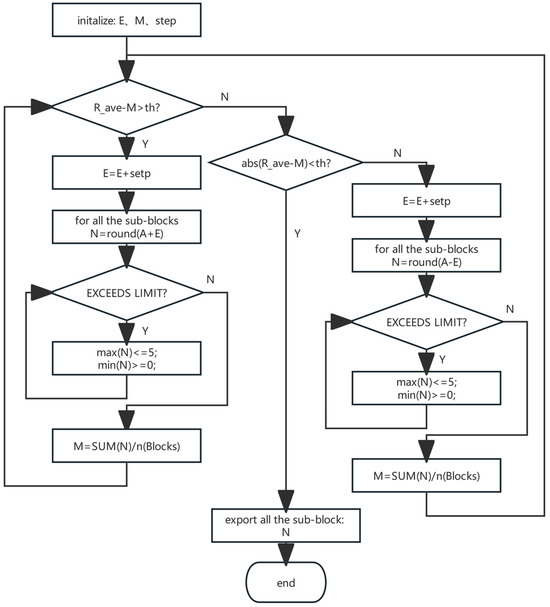 Considering the fact that the uniformity of the actual target scenario will lead to less high-frequency information in the Doppler spectrum, a small-amplitude dynamic range of the sub-block, and uniform energy of the sub-block, it is necessary to adjust the bit error control (BEC) part of the A-BAQ in order to ensure the requirement of the fixed-length coding of the integer number of bits of the BAQ quantizer, as well as the realization of the fractional bit rate coding in the homogeneous scenario. The flow of the improved bit error control coding is shown in Figure 6 below. The symbols defined in Figure 6 are shown in Table 2.