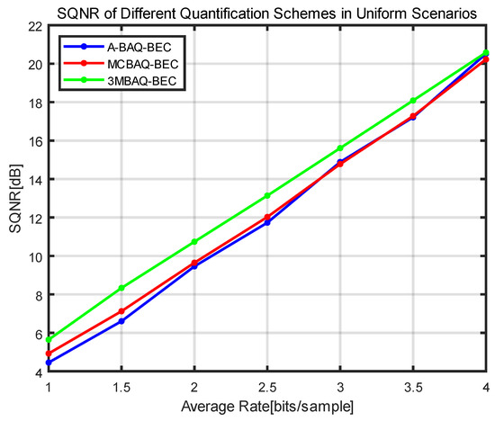 SQNR of homogeneous scenarios under different quantization schemes as a function of the average rate: 3MBAQ in green, MCBAQ-BEC in red, and A-BAQ-BEC in blue.