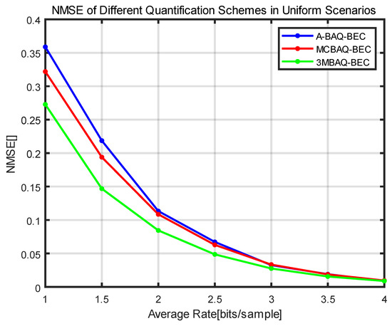 NMSE of homogeneous scenarios under different quantization schemes as a function of the average rate: 3MBAQ in green, MCBAQ-BEC in red, and A-BAQ-BEC in blue.