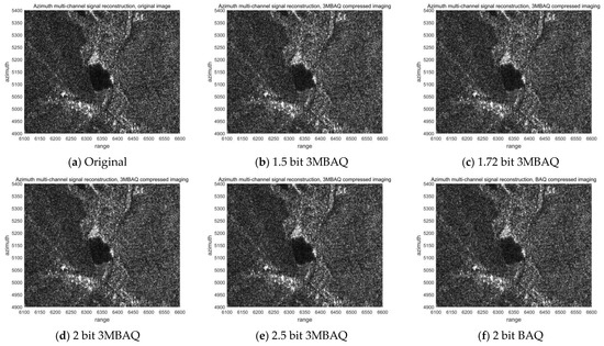 Taking the original image (a) and the image domain effect of BAQ algorithm at 2 bits (f) as a reference, (b–e) demonstrate the image domain compression effect of the 3MBAQ algorithm at different bits. The 3MBAQ algorithm achieves well-compressed results at all compression ratios, and the compression effect of the 1.72-bit 3MBAQ is similar to that of the 2-bit BAQ.