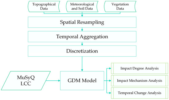 The geographic statistical models, such as the Geodetector Model (GDM), Single-Point Areal Estimation (SPA), Biased Sample Hospital-Based Area Disease Estimation (B-SHADE), etc., contribute to enhancing the analysis of the relationship between parameter spatial distribution and various environmental factors, thereby helping to improve the understanding of how the environment determines the development and changes of ecosystems [23,24,25,26]. Compared to other spatial analysis methods, the GDM is not restricted by linear assumptions, making it better suited for quantifying the contribution of independent variables to the dependent variable. It is effective in exploring the complex relationships among spatial data and assessing the impact of various factors on the spatial distribution characteristics of target variables. Researchers have extensively utilized this model to study the spatial relationships of different surface parameters [27]. In the medical and health fields, GDM is used to analyze the interrelation between newborn neural tube defects and the environment in a specific county in China [26]. In the field of urbanization research, GDM has also been proven to provide a reasonable explanation for the driving factors of urbanization in multiple regions of China [28]. In the ecological and environmental context, the geographical detector has also demonstrated its analytical capability for exploring the mutual relationships among spatial factors [29]. So, the geographic statistical models provide the potential to examine the impact of various environmental factors on LCC distribution and enable the assessment of ecosystem changes.