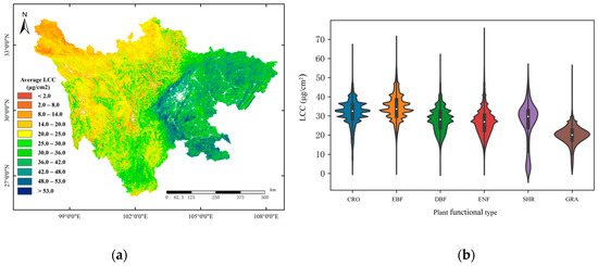 Average distribution of LCC in 2020 in Sichuan Province (a) and different vegetation types (b). In (b), vegetation types include Cropland (CRO), Evergreen Broadleaf Forest (EBF), Deciduous Broadleaf Forest (DBF), Evergreen Needleleaf Forest (ENF), Shrubland (SHR), and Grassland (GRA).