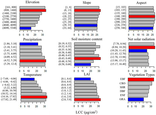 The annual average LCC corresponding to the different strata of the nine influencing factors in 2020 is shown in Figure 5. The most significant strata differences in LCC are observed in temperature, elevation, and vegetation types, corresponding to the high q-values in Table 3. The minimal and maximal average LCC among all nine factors appears in the highest and second lowest elevation strata, reverifying the most significant correlation with elevations. The average LCC increases with higher temperature and increased precipitation until the temperature exceeds 17.82 °C and 5.29 mm (i.e., the second-to-last strata for both factors), which begins to decline. The linear relationship with precipitation is relatively less significant than temperature and elevation. Among the six vegetation types in the study area, EBF has the highest average LCC, followed by CRO. The GRA has minimal values. No significant linear relationship with soil moisture content is observed. The difference in average LCC among different slopes and aspect strata is minimal and consistent with low q-values (Table 3). The slight difference indicates that the LCC is higher on the aspect facing south (aspect = 180°) and lower slopes.