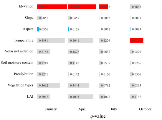 - The q-values for all influencing factors are higher in winter and spring and lowest in summer. The elevation, temperature, and precipitation stress vegetation growth strongly in winter and spring, and the influence significantly weakens in summer since the optimal growing conditions alleviate stress from any factor on vegetation growth.