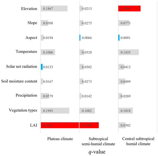 Overall, the q-values of the nine factors differ more significantly, and the sum of the nine q-values is more significant in the plateau climate zone than in the other two climate zones, indicating that the influencing factors have more constraints on photosynthesis in the plateau climate. In the subtropical humid climate zone, the overall conditions for solar radiation, temperature, and rainfall favor plant growth, resulting in fewer constraints imposed by topography, meteorology, and other factors.